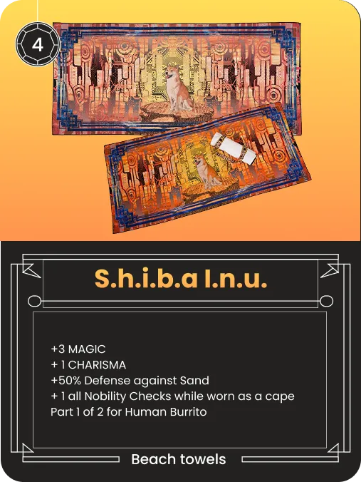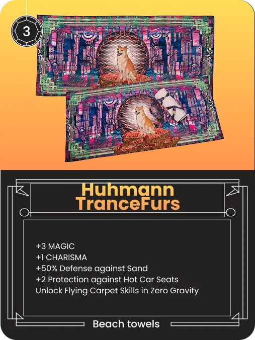 These towels have an infinite number of uses including you can use it to dry off, for any intergalactic adventure (or really any adventure) having a towel is clutch. Measuring 60x30 and made from space age moisture wicking microfibers, it also comes with it’s own limited edition strap to haul it around with (if you are the sort of person that appreciates a firmly secured towel) and Comes with numbered and signed limited edition print and NFT.